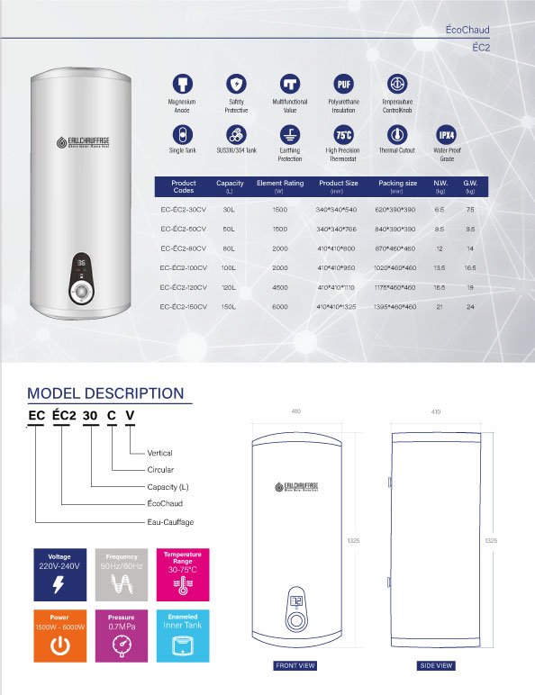 إن سخان المياه الكهربائي EC2 ÉcoChaud EC2 صُمم بجودة عالية لتوفير مياه ساخنة مستقرة وآمنة للمنازل والمرافق المختلفة. وهي مجهزة بعزل حراري متطور وتحكم دقيق في درجة الحرارة، وتوفر حلاً عملياً وفعالاً من حيث التكلفة للاستخدام طويل الأمد.