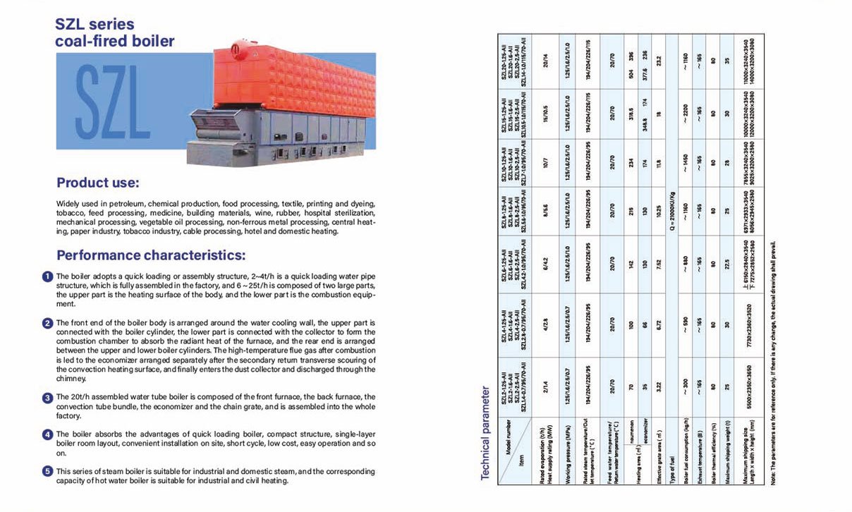 إن غلاية تعمل بالفحم من سلسلة SZL هي غلاية أنبوبية مائية عالية الأداء مصممة للتطبيقات الصناعية والمنزلية. وهي تستخدم على نطاق واسع في البترول والمعالجة الكيميائية وإنتاج الأغذية والمنسوجات والمستحضرات الصيدلانية ومواد البناء والمستشفيات والورق والتبغ والتدفئة المركزية وغيرها.