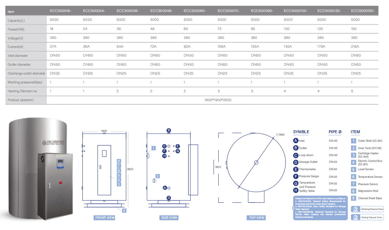 Grande capacité chauffe-eau électriques centraux, Les chauffe-eau à eau chaude sont conçus pour répondre aux besoins importants des installations commerciales et industrielles. Équipés d'une technologie de pointe pour assurer un débit d'eau chaude continu avec une grande efficacité, ils constituent la solution idéale pour les hôtels, les hôpitaux, les écoles, les usines et les grands bâtiments.