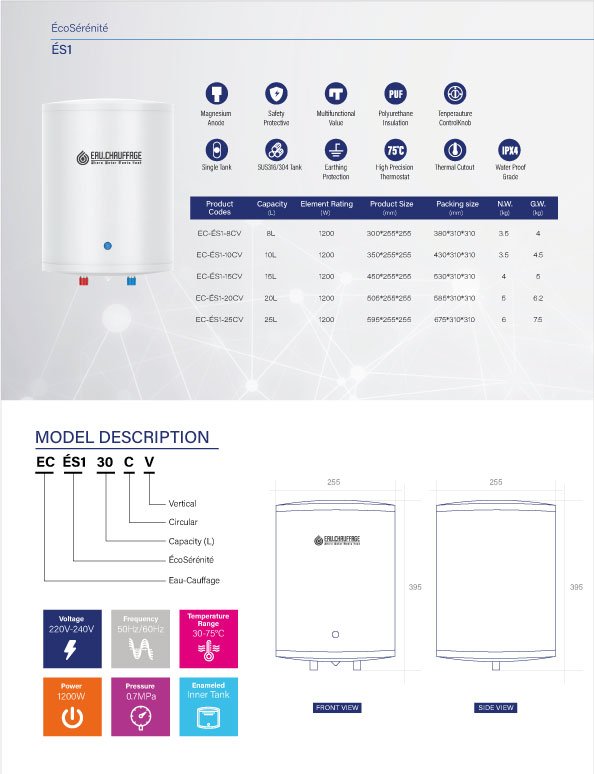 Les ÉcoSérénité ES1 Chauffe-eau électrique est conçu pour fournir de l'eau chaude de manière sûre et efficace dans des espaces compacts. Avec plusieurs options de petite capacité et une technologie d'isolation avancée, c'est la solution parfaite pour les besoins quotidiens des ménages et des installations de service.