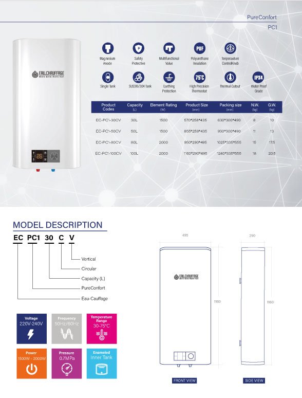 Les PureConfort PC1 Chauffe-eau électrique est conçu pour fournir de l'eau chaude sûre, efficace et fiable aux ménages et aux petites installations. Avec sa conception compacte verticale et son panneau de commande numérique moderne, il offre un confort et une commodité avancés tout en conservant des performances de haut niveau.