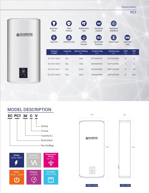 Les PureConfort PC7 Chauffe-eau électrique est conçu pour fournir de l'eau chaude sûre, efficace et fiable aux ménages et aux petites installations. Avec sa conception compacte verticale et son panneau de commande numérique moderne, il offre un confort et une commodité avancés tout en conservant des performances de haut niveau.