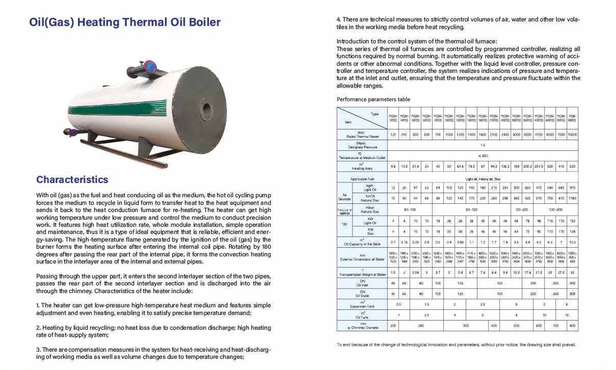 Il YYWQ olio (gas) riscaldamento caldaia ad olio termico è una soluzione di riscaldamento industriale ad alta efficienza progettata per funzionare con olio o gas come combustibile e olio termoconduttore come fluido. Grazie a una pompa di circolazione dell'olio caldo, il fluido viene riciclato in forma liquida, trasferendo il calore alle apparecchiature e tornando poi al forno per il riscaldamento. Questo sistema raggiunge temperature di lavoro elevate a bassa pressione, garantendo una conduzione del calore precisa e sicura.