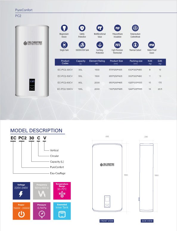 The PureConfort PC2 Electric Water Heater is crafted to deliver safe, efficient, and reliable hot water for households and small facilities. With its vertical compact design and modern digital control panel, it provides advanced comfort and convenience while maintaining top performance.