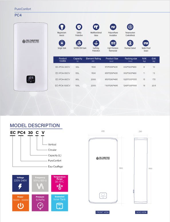 The PureConfort PC4 Electric Water Heater is crafted to deliver safe, efficient, and reliable hot water for households and small facilities. With its vertical compact design and modern digital control panel, it provides advanced comfort and convenience while maintaining top performance.