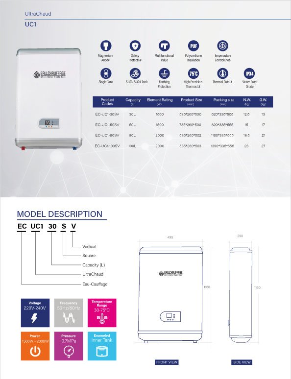 The UltraChaud UC1 Electric Water Heater combines advanced technology, safety, and a modern square design to deliver efficient hot water solutions for homes and small facilities. With its compact vertical design and digital control panel, it ensures convenience, energy savings, and long-term reliability.