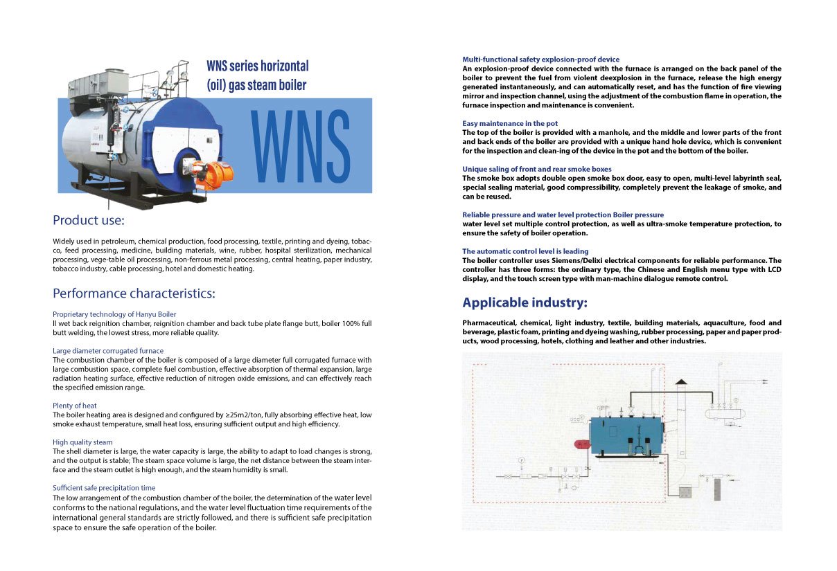 The WNS Series Horizontal Oil/Gas Steam Boiler is a high-performance, fully automatic boiler designed for reliable operation and wide industrial use. It is extensively applied in petroleum, chemical production, food processing, textiles, printing and dyeing, pharmaceuticals, feed processing, building materials, rubber, hospital sterilization, paper, central heating, and more.
