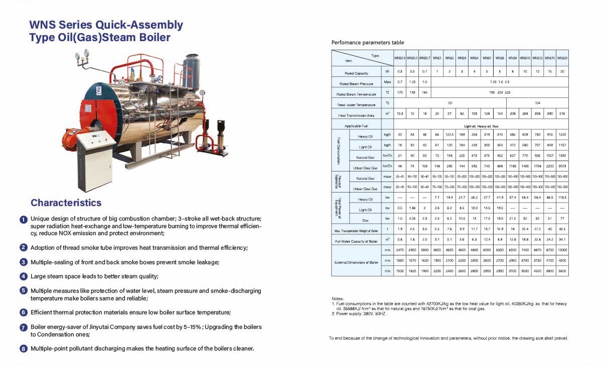 With compact dimensions, quick assembly design, and flexible fuel compatibility (light oil, heavy oil, natural gas, coal gas), the WNS Series is widely applicable across industries such as food processing, textiles, chemicals, paper, central heating, and more.